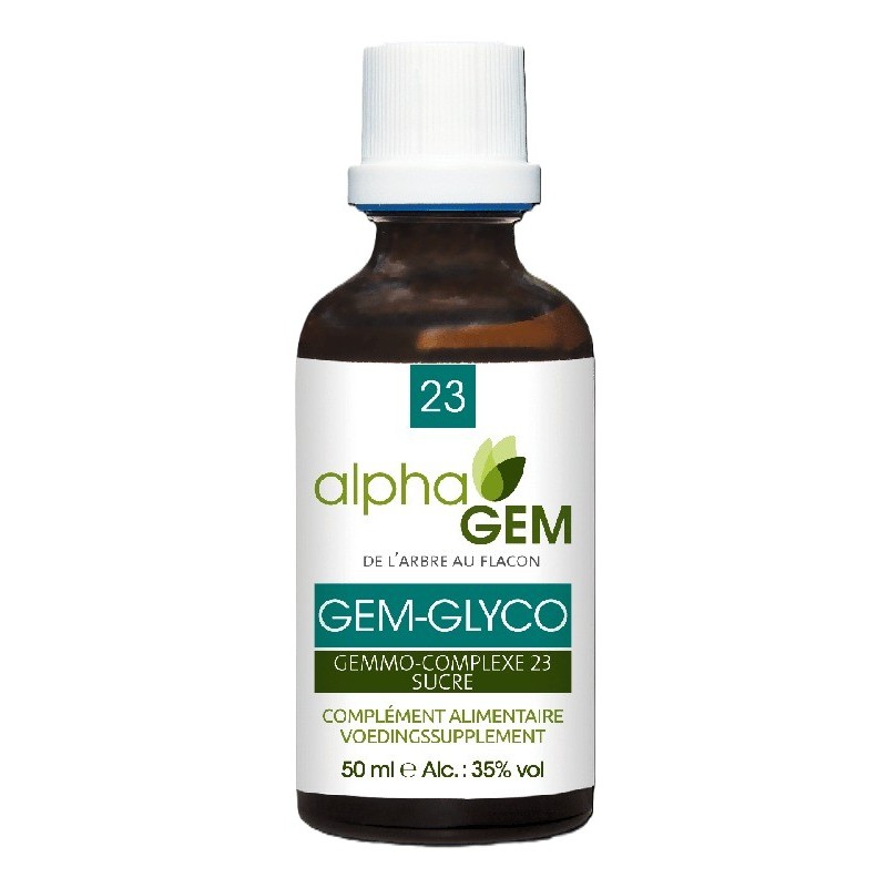 GEM-GLYCO COMPLEXE N°23 BIO du laboratoire AlphaGEM est un complexe de bourgeons contribuant à soutenir la glycémie. L'association des jeunes pousses de Genévrier, de Myrtillier, d'Olivier, des bourgeons de Mûrier, de l'hydrolat de Romarin et de Citronnier, un macérât de Cannelle et une teinture-mère d'Oignon permet de participer à l'équilibre de la glycémie.