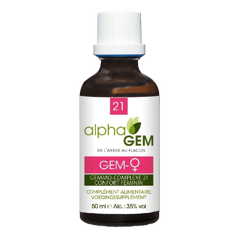 GEM-FEMME COMPLEXE N°21 BIO du laboratoire AlphaGEM est un complexe de bourgeons contribuant à soutenir le confort de la femme de plus de 50 ans. L'association des jeunes pousses d'Airelle et de Framboisier permet d'atténuer les symptômes liés à la ménopause.