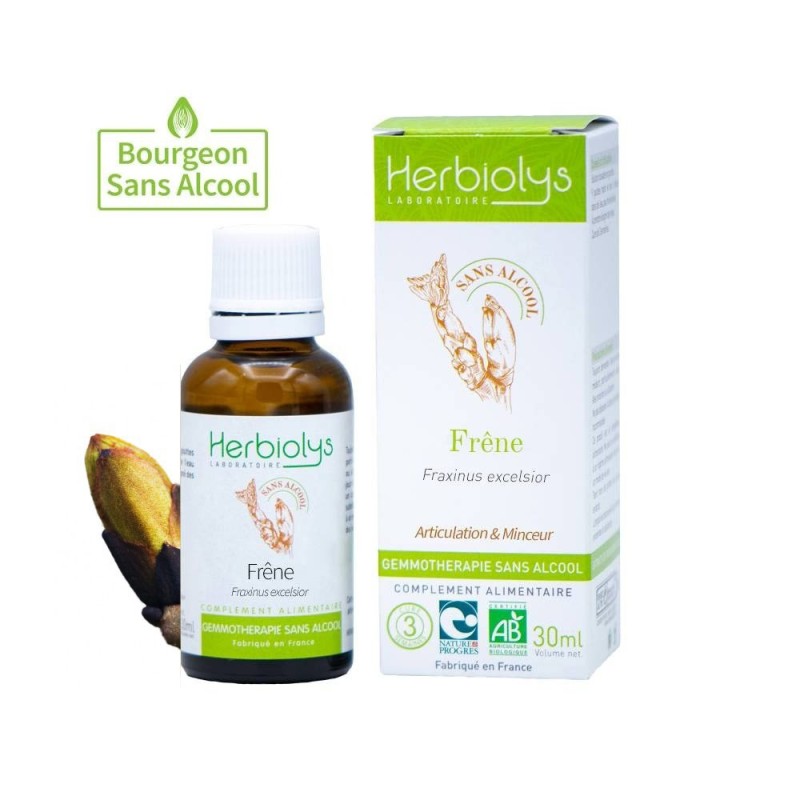 Ingrédients par dose journalière (18 gouttes) : Bourgeon de feuille frais de Frêne Bio (Fraxinus excelsior) - 43 mg, Additifs : Glycérine végétale Bio, Eau de source peu minéralisée.