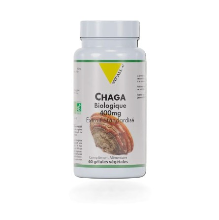 Ingrédients pour 1 gélule : Chaga* (Inonotus obliquus) sclérote - 400 mg, Hypromellose (Agent d'enrobage 100% végétal).