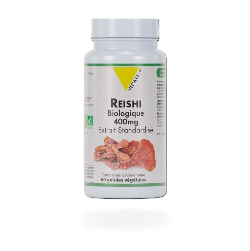 Complément alimentaire en gélule avec du Reishi (Ganoderma lucidum) issu de l'Agriculture Biologique connu comme “le champignon de l’éternelle jeunesse”.
