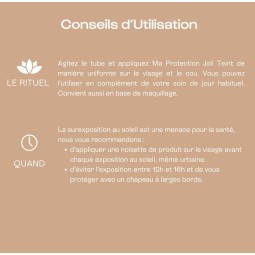 Agitez le tube et appliquez Ma Protection Joli Teint de manière uniforme sur le visage et le cou. Vous pouvez l’utiliser en complément de votre soin de jour habituel. Convient aussi en base de maquillage.