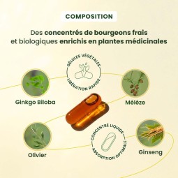 Cette formule 100% d'origine végétale est à base de Mélèze, Olivier et Ginkgo biloba qui contribue à une bonne mémoire et de Ginseng qui contribue à améliorer la concentration et aide pour le stress et la fatigue. Les bourgeons frais et Biologiques naturellement concentrés en polyphénols sont reconnus pour leur capacité antioxydante.