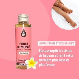 L'HUILE VÉGÉTALE DE MONOÏ, 100% Pure et Naturelle, est concentrée en Vitamines antioxydantes (Vitamine E). Grâce à ses propriétés hydratantes, elle nourrit en profondeur les peaux matures ou sèches. Tonifiante et assouplissante, l'huile de Monoï peut être utilisée sur la peau. Idéale pour les cheveux ternes et fatigués, elle apporte brillance et vitalité.