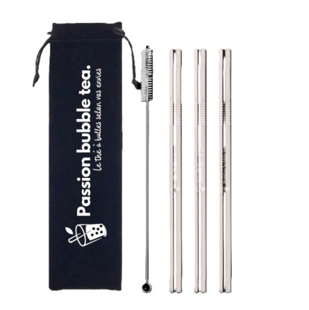 Ce KIT BUBBLE TEA comprend 3 pailles en Acier Inoxydable, une brosse de nettoyage et une pochette de rangement pour vous accompagner partout. Avec leur look argenté sobre et élégant, ces pailles s’intègrent parfaitement à votre routine quotidienne.