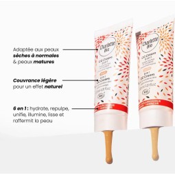 LA CC CRÈME BIO 6EN1 GOLD est une crème teintée Naturelle certifiée Bio, Vegan et fabriquée en France. Conçue pour les peaux sèches à normales ainsi que pour les peaux matures, elle combine soin hydratant et maquillage léger pour un résultat lumineux et naturel en un seul geste. Véritable soin perfecteur 6EN1, elle hydrate, repulpe, lisse, raffermit, unifie et illumine le teint tout en offrant une couvrance légère pour un effet peau nue naturel.