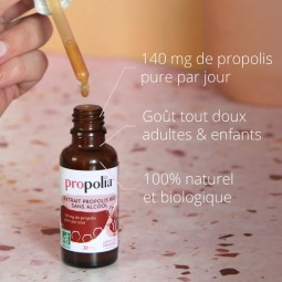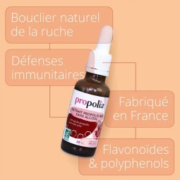 Retrouvez toute l'expertise Propolia®, grâce à l'extrait de Propolis Bio Sans Alcool concentrée à 100% d'extrait de Propolis Bio purifiée pour une action 100% Naturelle qui vous aide à maintenir vos défenses immunitaires :