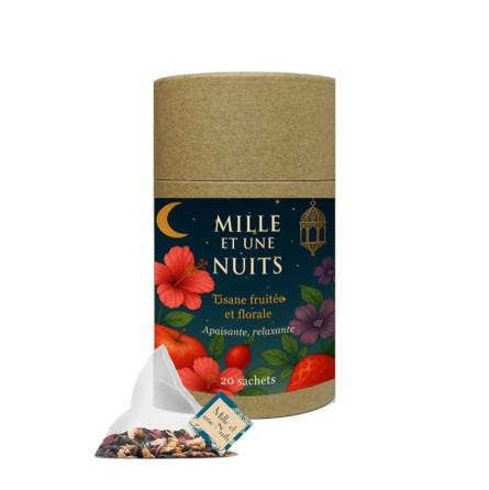 LA TISANE MILLE ET UNE NUITS est un mélange pour le plaisir des papilles avec uniquement des plantes, des fruits et des fleurs évoquant un voyage sensoriel au cœur des rêves...Mille et Une Nuits, c’est une infusion féerique qui invite à la rêverie et à la douceur comme une histoire racontée au clair de lune.